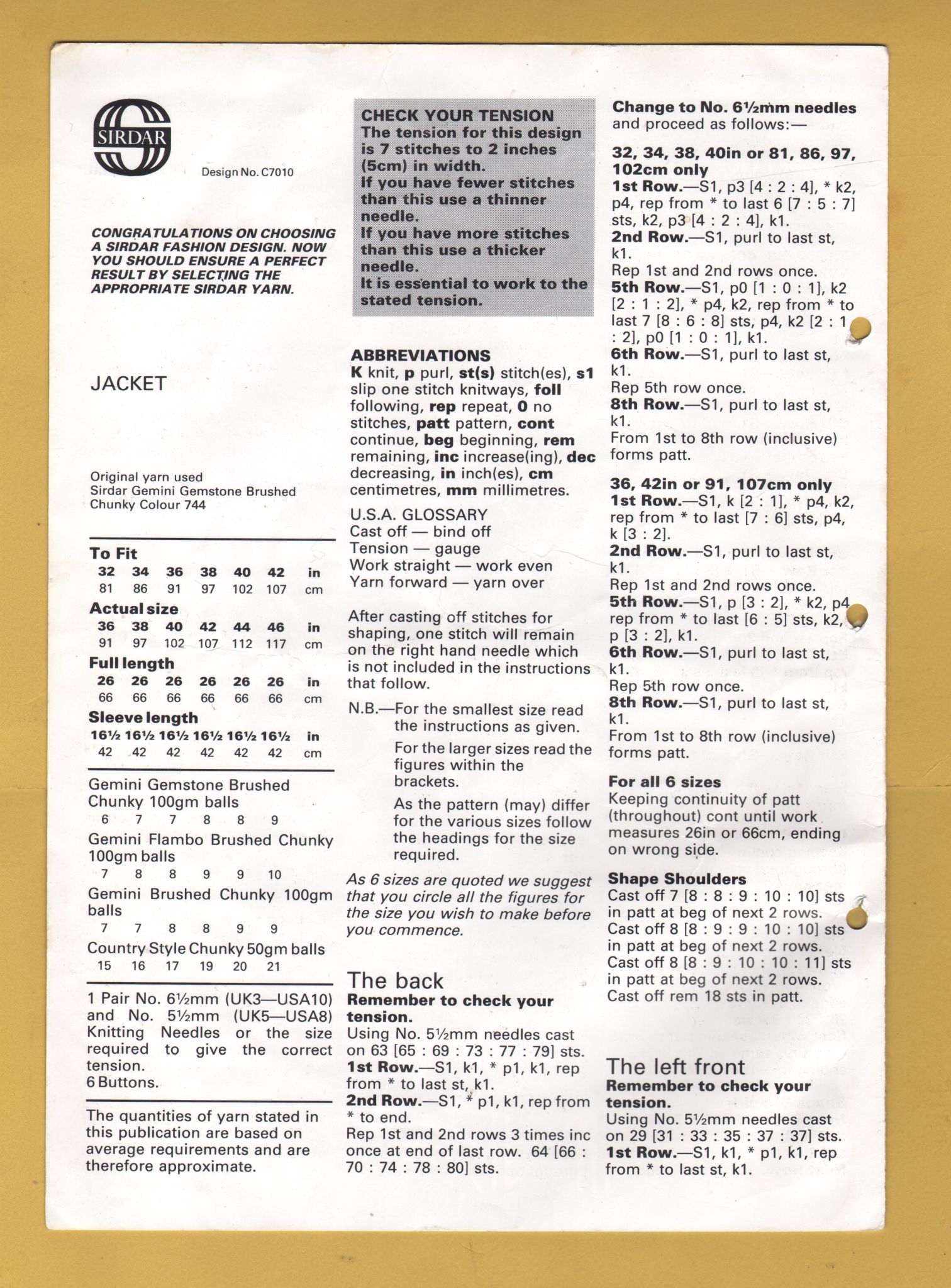 Tags: Sirdar, Chunky, 32-42", No.C7010, Jacket:Knitting Pattern
