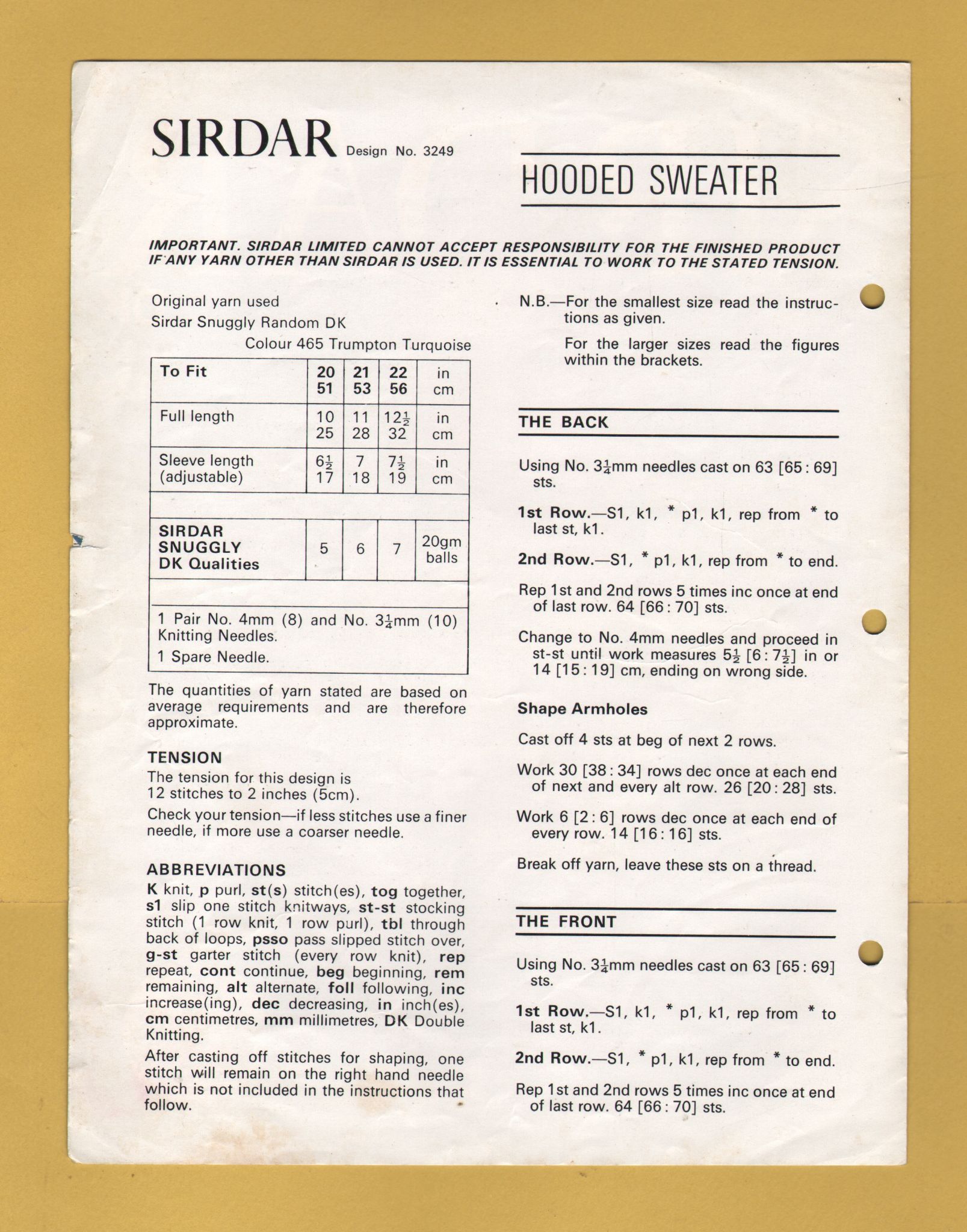 Tags: Sirdar, Double Knitting, 20-22", No.3249, Hooded Sweater:Knitting Pattern