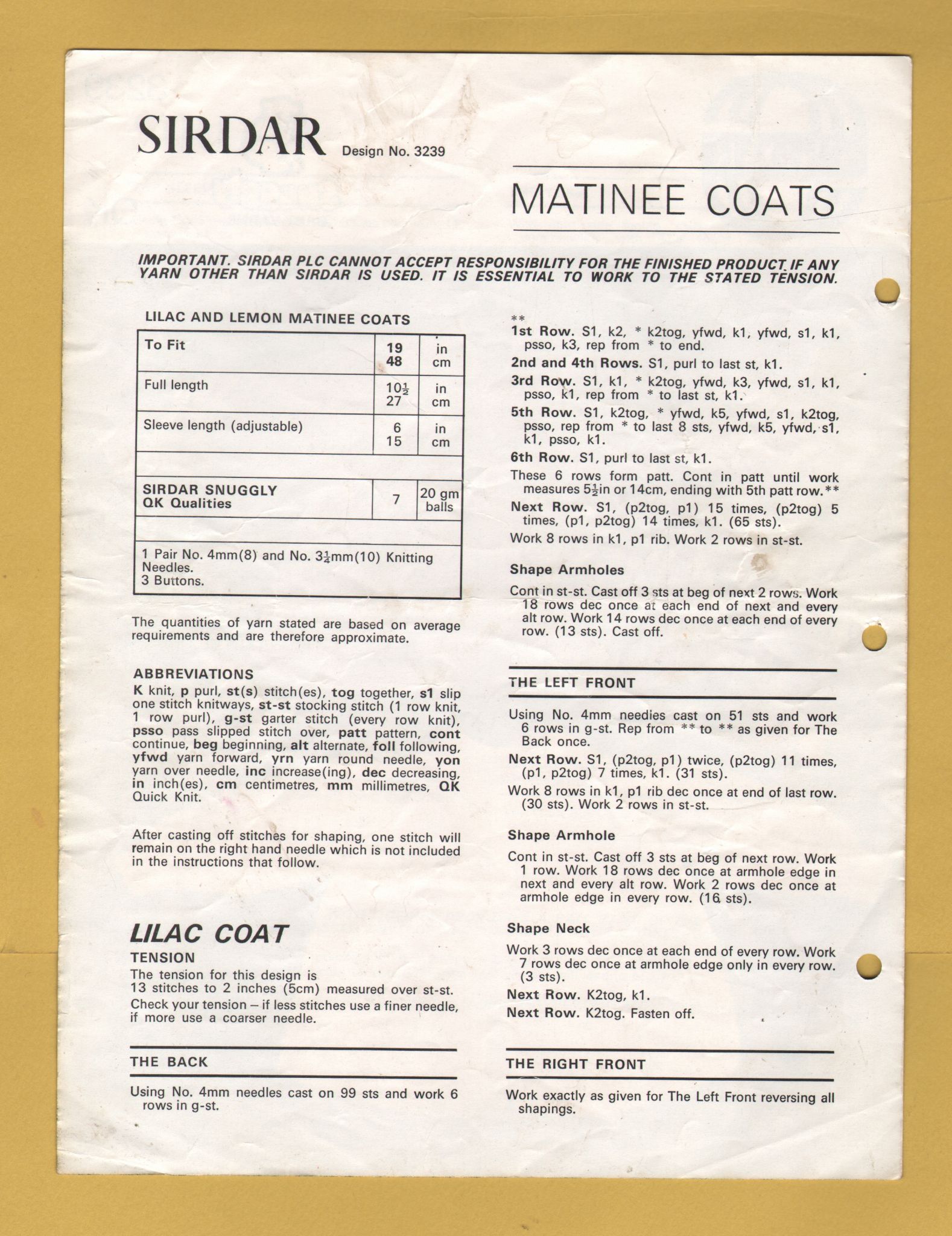 Tags: Sirdar, QK, 19", No.3239, Matinee Coats:Knitting Pattern