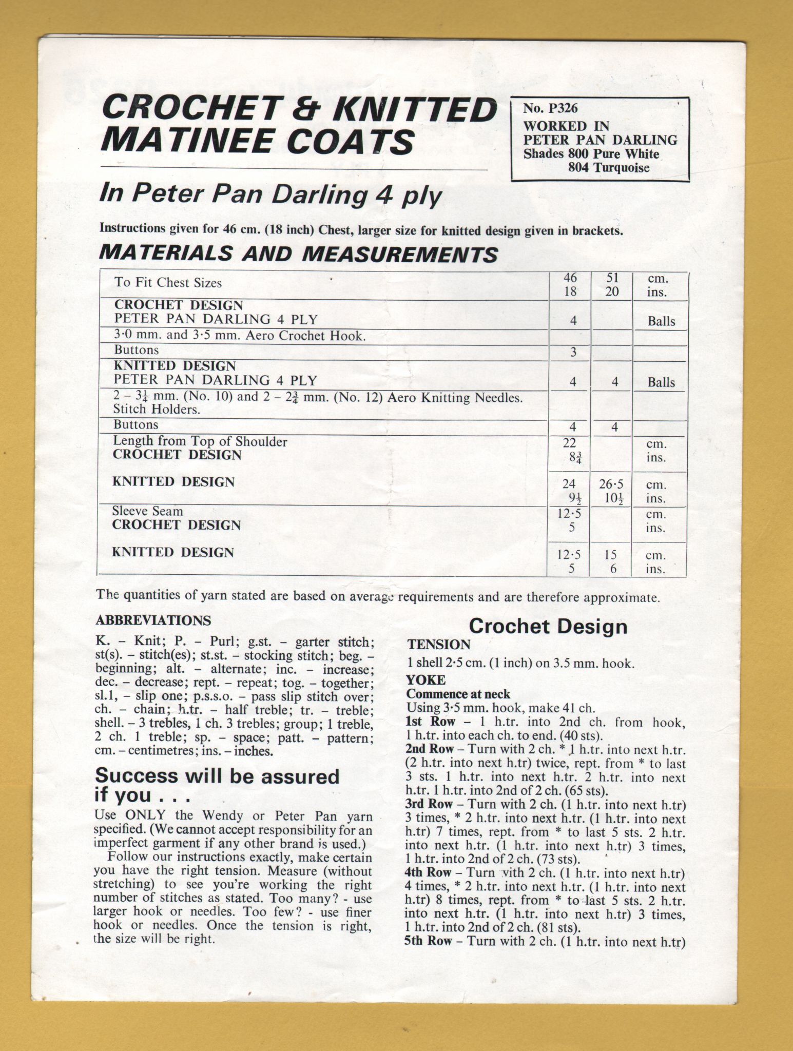 Tags: Peter Pan, 4 Ply, 18-20", No.P326, Crochet, Knitted Matinee Coats:Knitting Pattern
