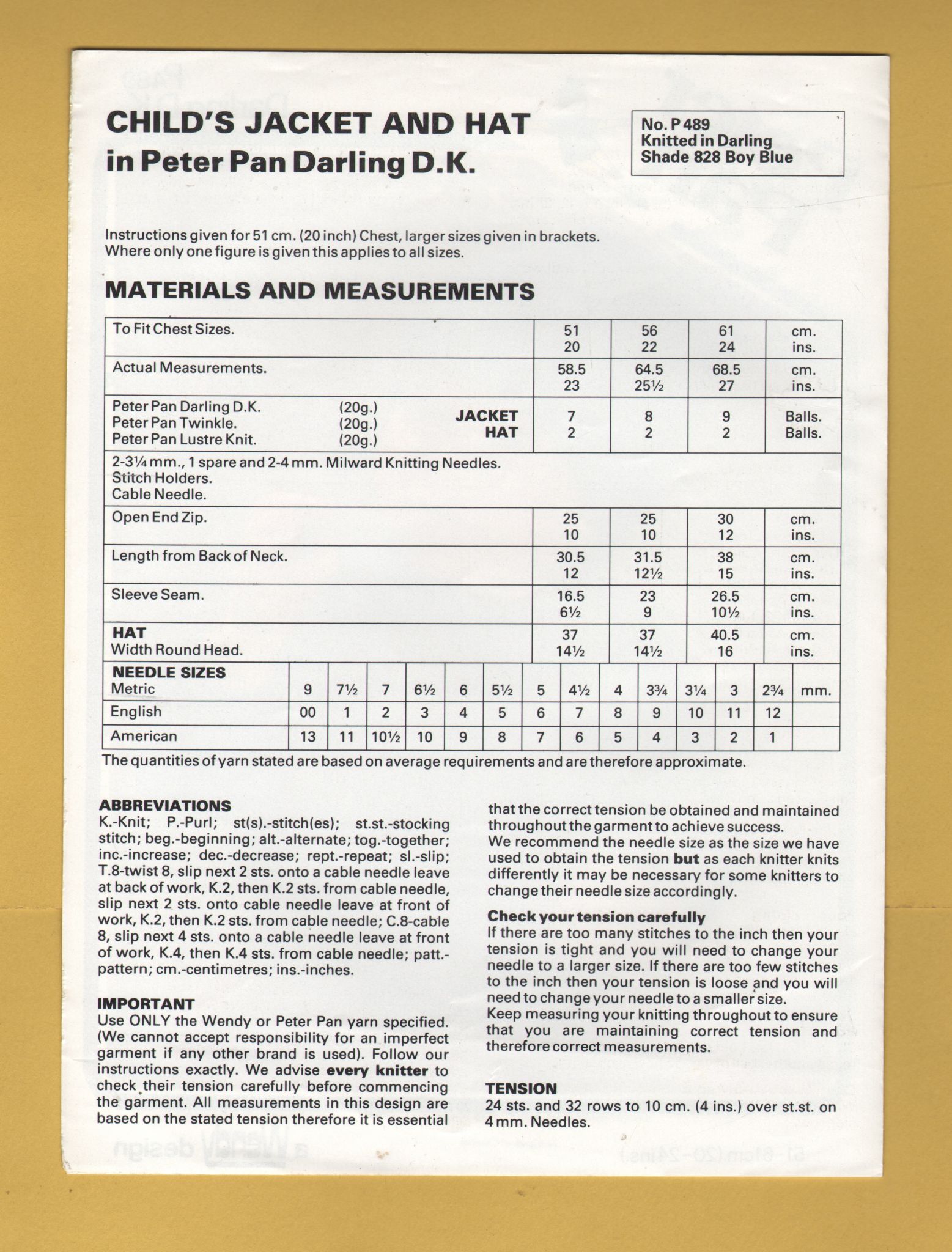 Peter Pan - Darling DK - 20-24" (51-61cm) - Design No.P489 - Child`s Jacket & Hat - Knitting Pattern Peter Pan - Darling DK - 20-24" (51-61cm) - Design No.P489 - Child`s Jacket & Hat - Knitting Pattern