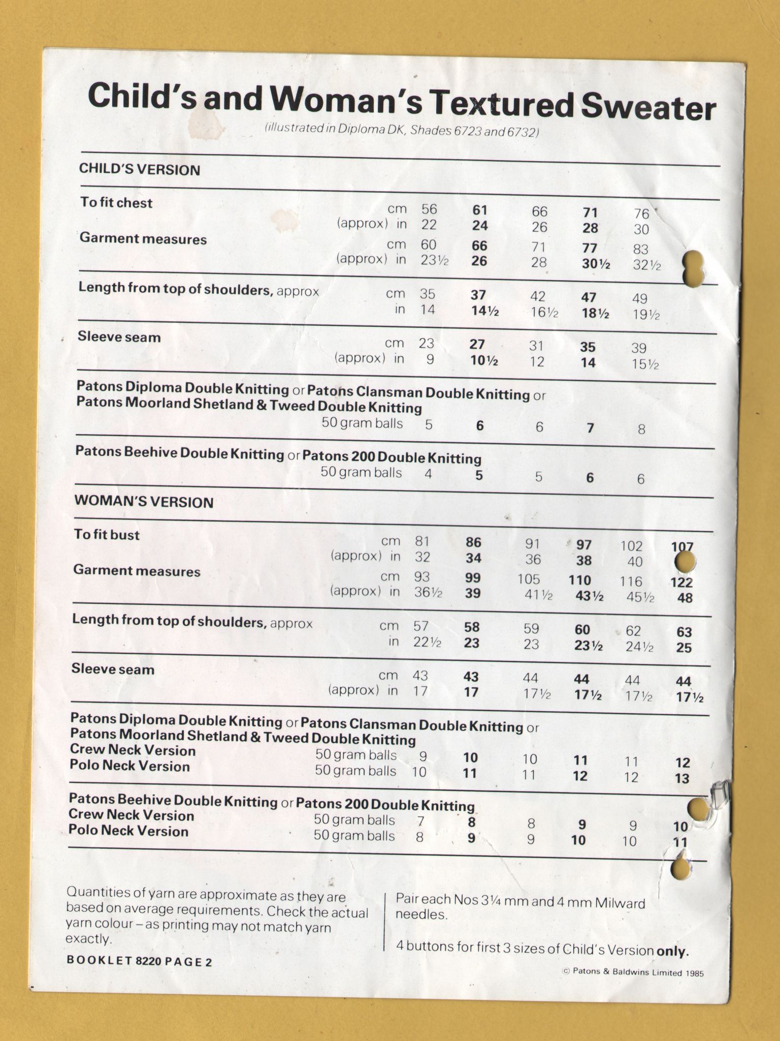 Tags: Patons, Double Knitting, Chest Sizes 22 to 42", No.8220, Child, Woman`s Textured Sweater:Knitting Pattern