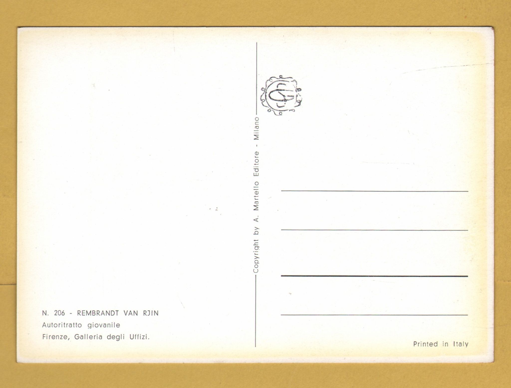 `Florence, Uffizi Gallery - Youthful Self Portrait by Rembrandt Van Rjin` - Postally Unused - A.Martello Postcard. `Florence, Uffizi Gallery - Youthful Self Portrait by Rembrandt Van Rjin` - Postally Unused - A.Martello Postcard.