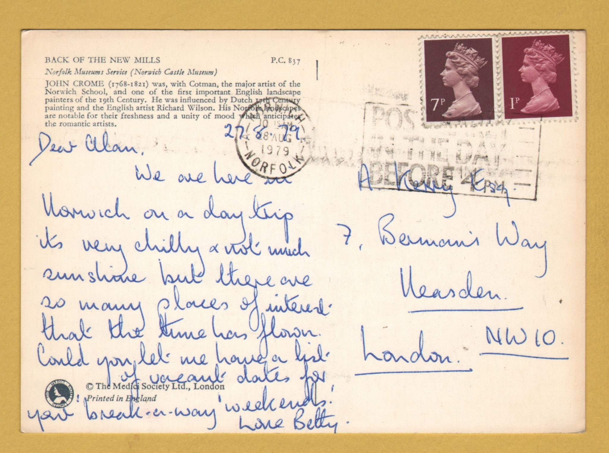 `Back of the New Mill by John Crome` - Postally Used-1979 - The Medici Society Postcard.