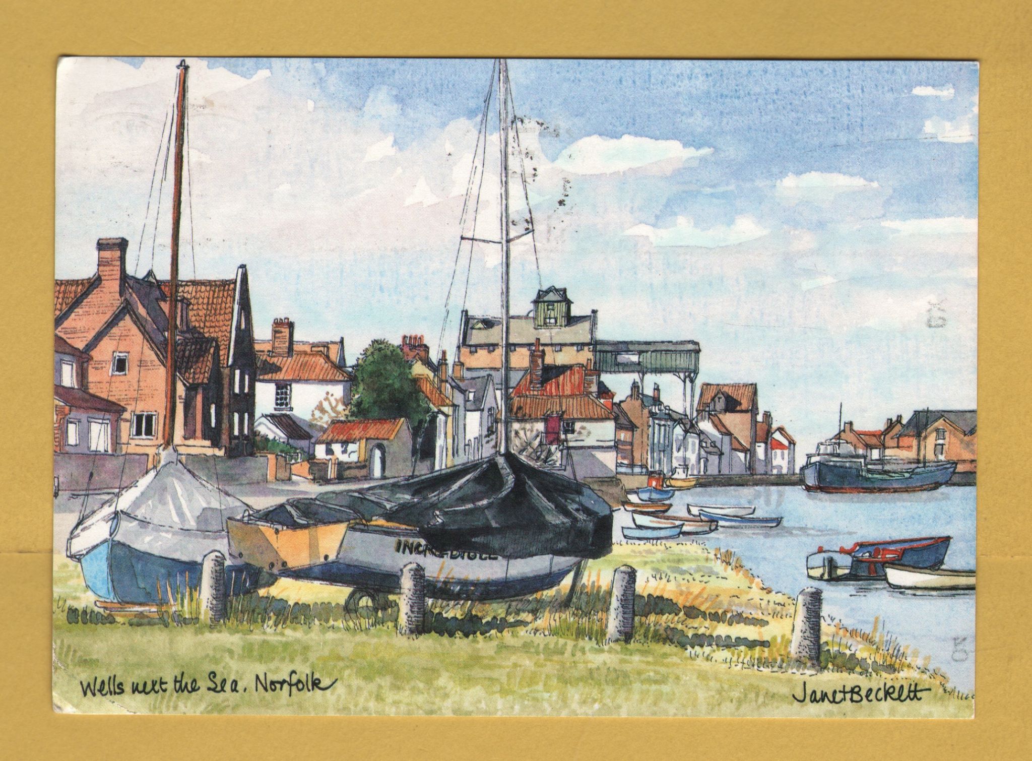`East End, Wells next the Sea by Janet Beckett` - Postally Used-1992 - Norfolk Central Printers Postcard.