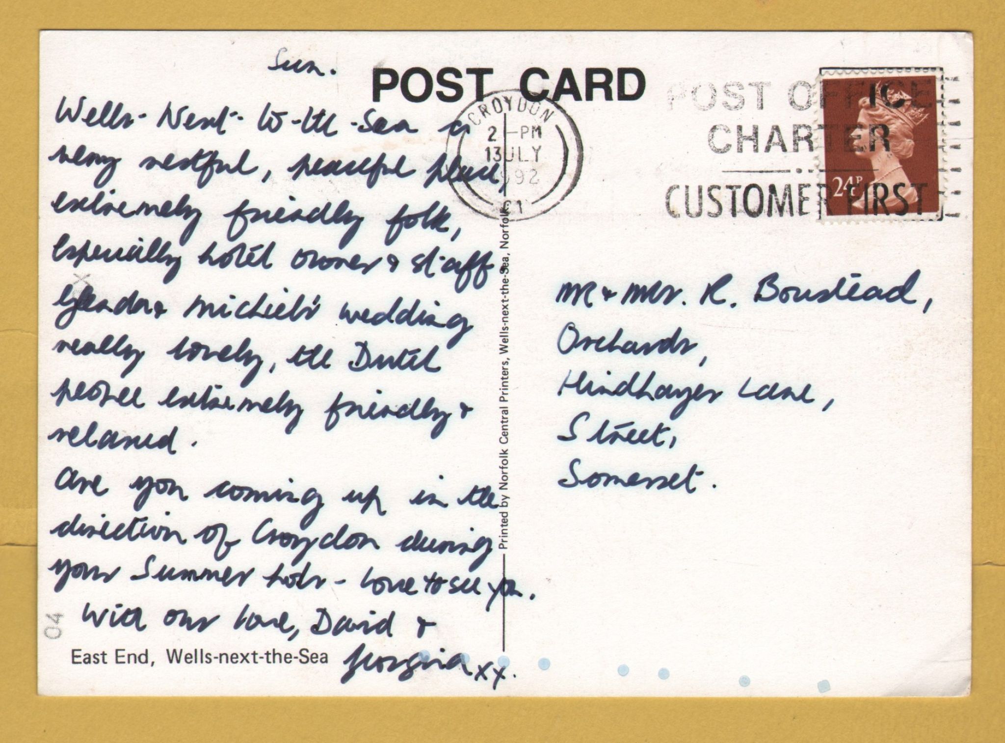 Tags: East End, Wells next the Sea, Janet Beckett:Used, 1992, Norfolk, Postcard.