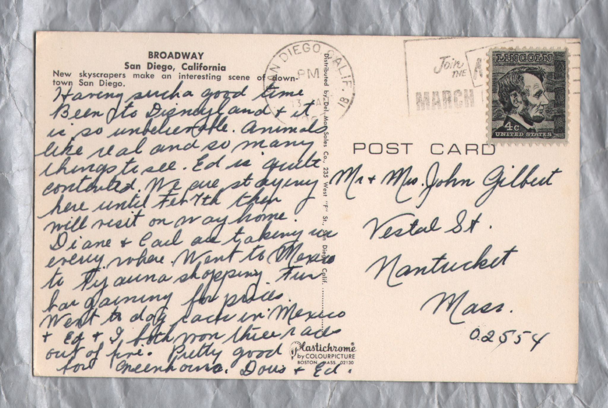 Tags: BROADWAY, San Diego, California, Postally Used, 1967, Postmark, Slogan, Plastichrome Postcard