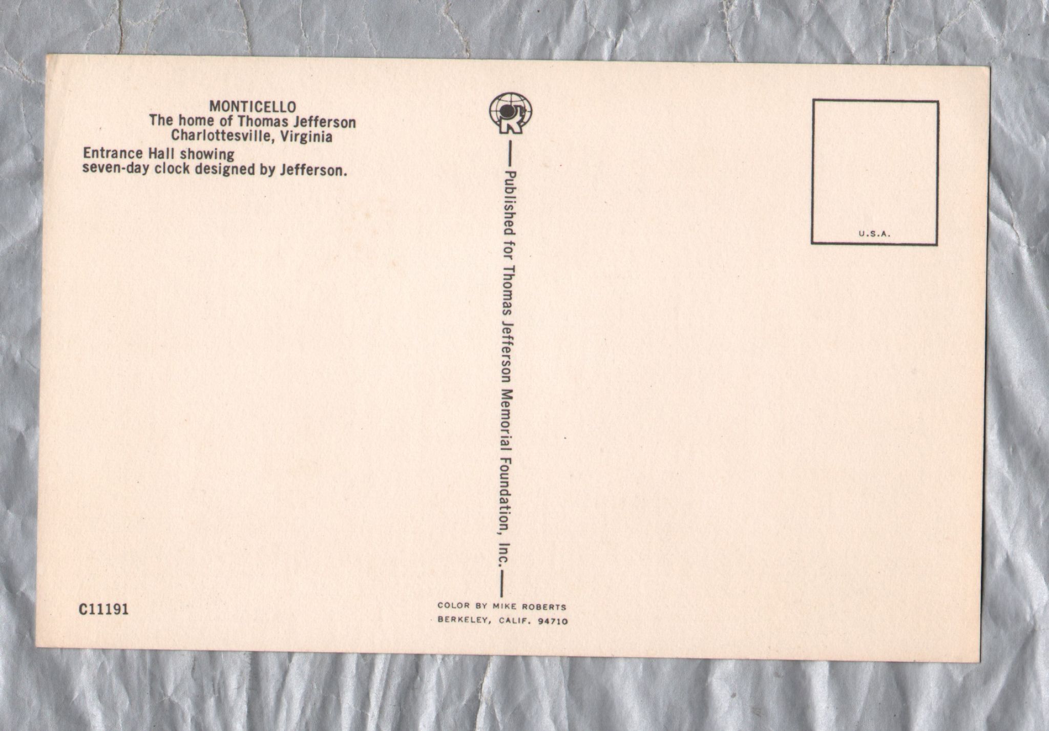 `Monticello - Entrance Hall Showing Seven-Day Clock Designed By Jefferson` - Postally Unused - Thomas Jefferson Memorial Foundation Postcard `Monticello - Entrance Hall Showing Seven-Day Clock Designed By Jefferson` - Postally Unused - Thomas Jefferson Memorial Foundation Postcard