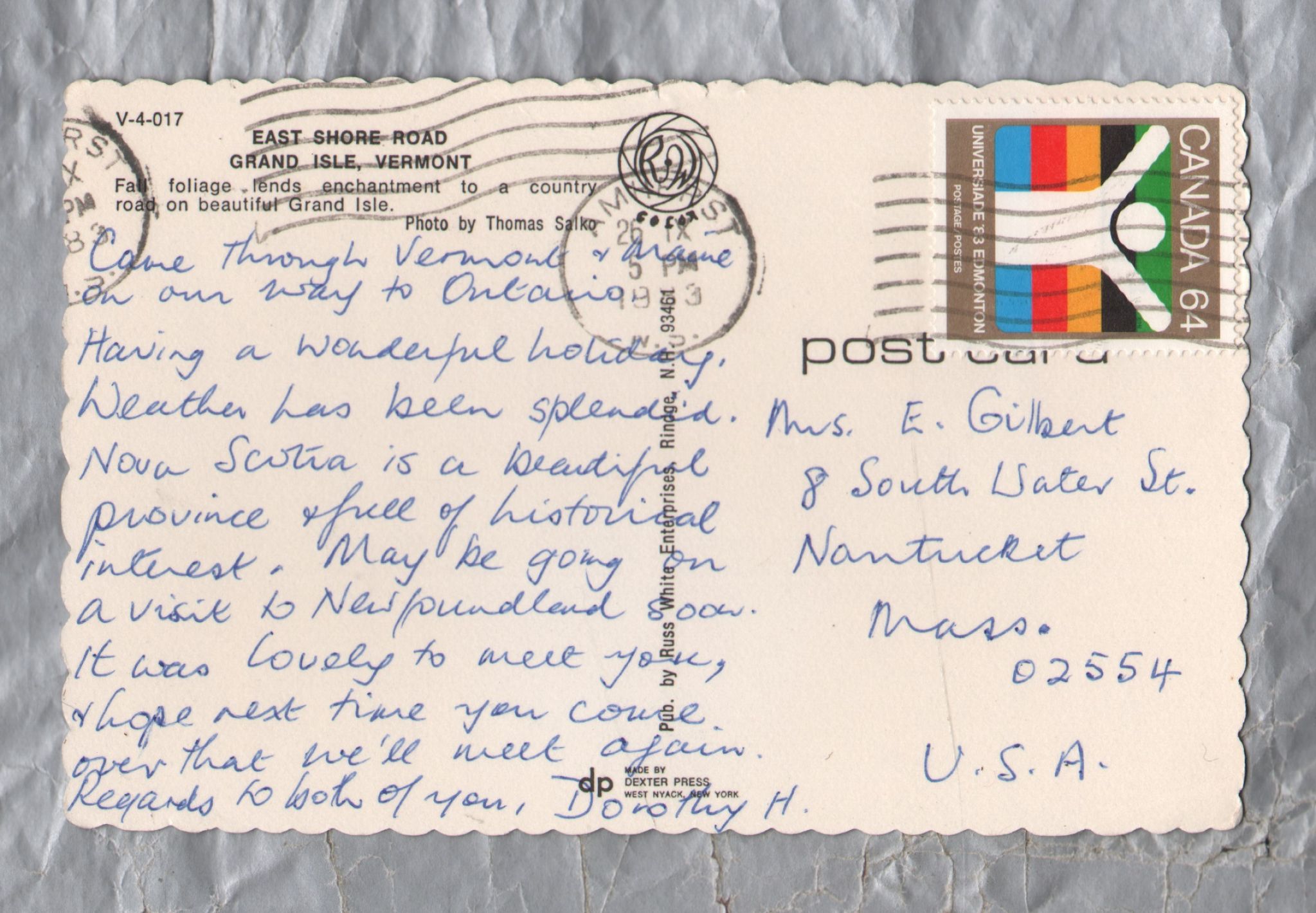 Tags: East Shore Road, Grand Isle, Vermont, Postally Used, Amherst, 1983, Russ White Enterprises, Postcard