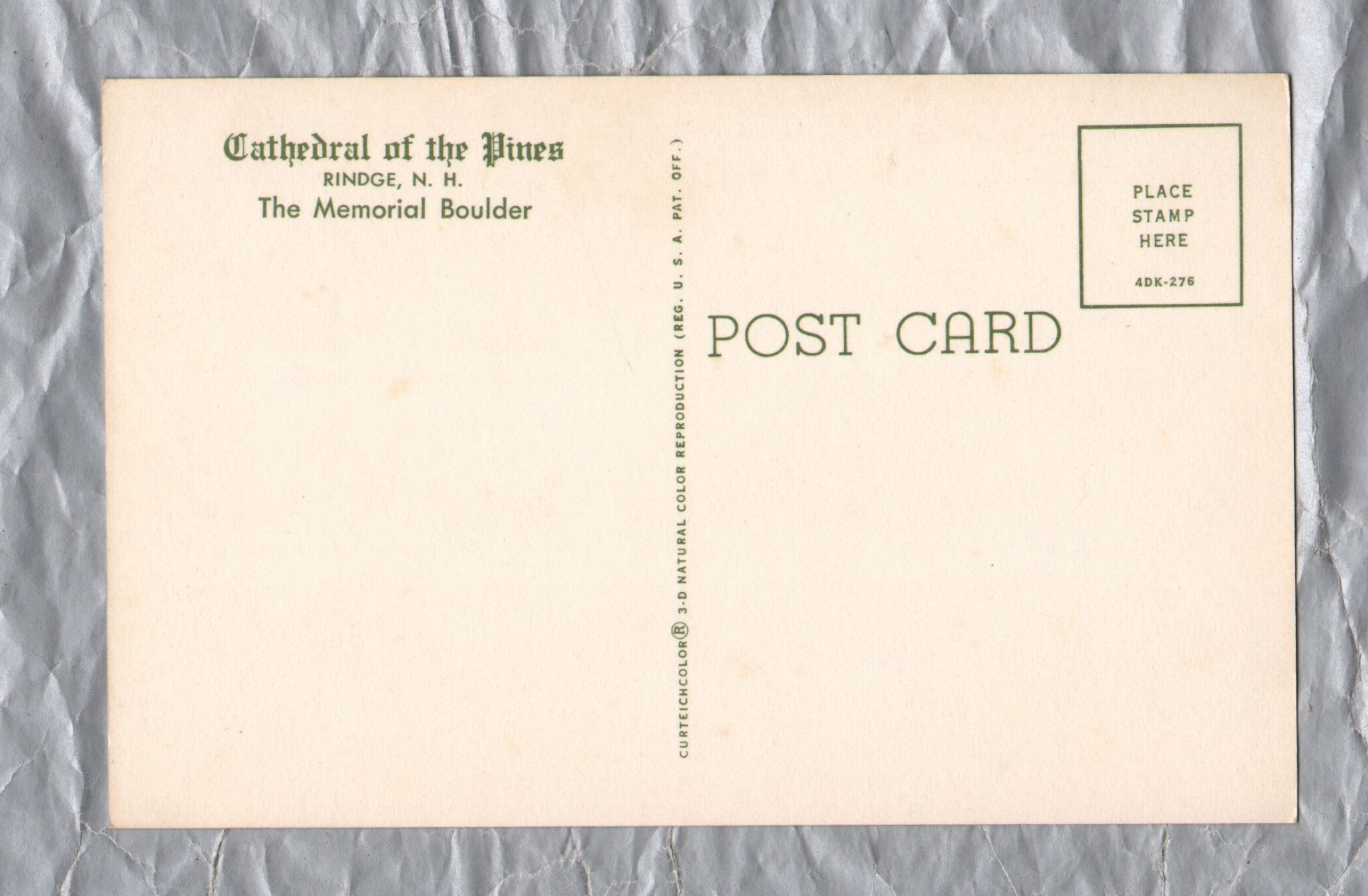 Tags: Cathedral Of The Pines, Rindge, Memorial Boulder, Postally Unused, Curteichcolor Postcard