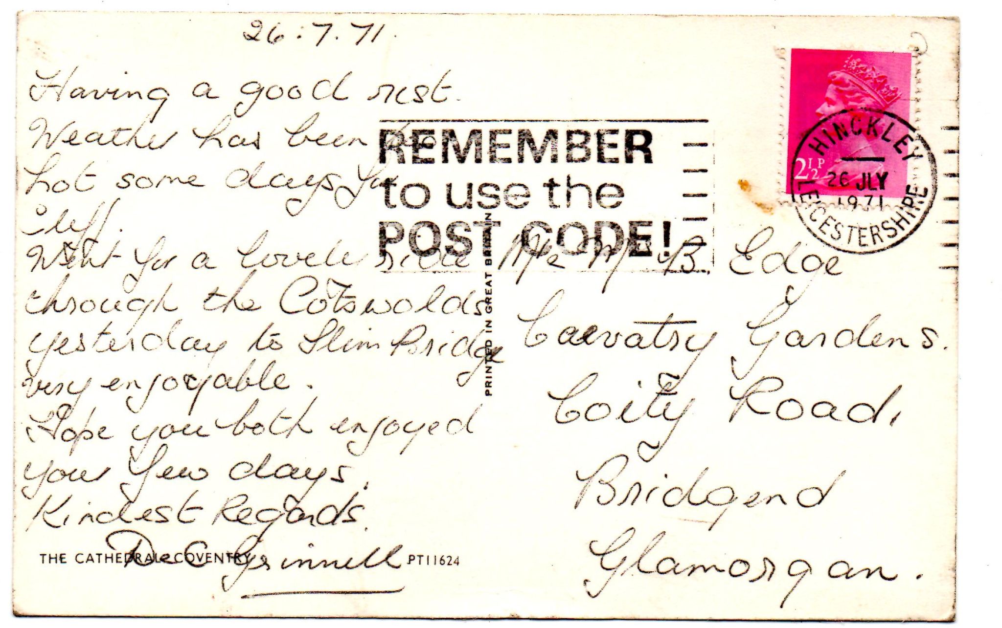 Tags: Cathedral, Coventry, Postally Used, Hinckley, 26 July 1971, Leicestershire, Postmark, Slogan, Real Photograph, Postcard